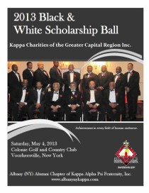 The Albany (NY) Alumni Chapter of Kappa Alpha Psi Fraternity, Inc. and Kappa Charities of the Greater Capital Region, Inc. held its 2013 Black & White Scholarship Ball on Saturday, May 4, 2013. Close to 230 people attended the event. It was held at the Colonie Golf and Country Club located at 141 Maple Road Route 85, Voorheesville, NY 12186. Over $10,000 in scholarships and prizes were handed out. The Scholarship Ball is our major fundraising event which supports our scholarship and mentorship programs. Since our scholarship fund's inception, more than 50 students in the Capital District area have received scholarships.